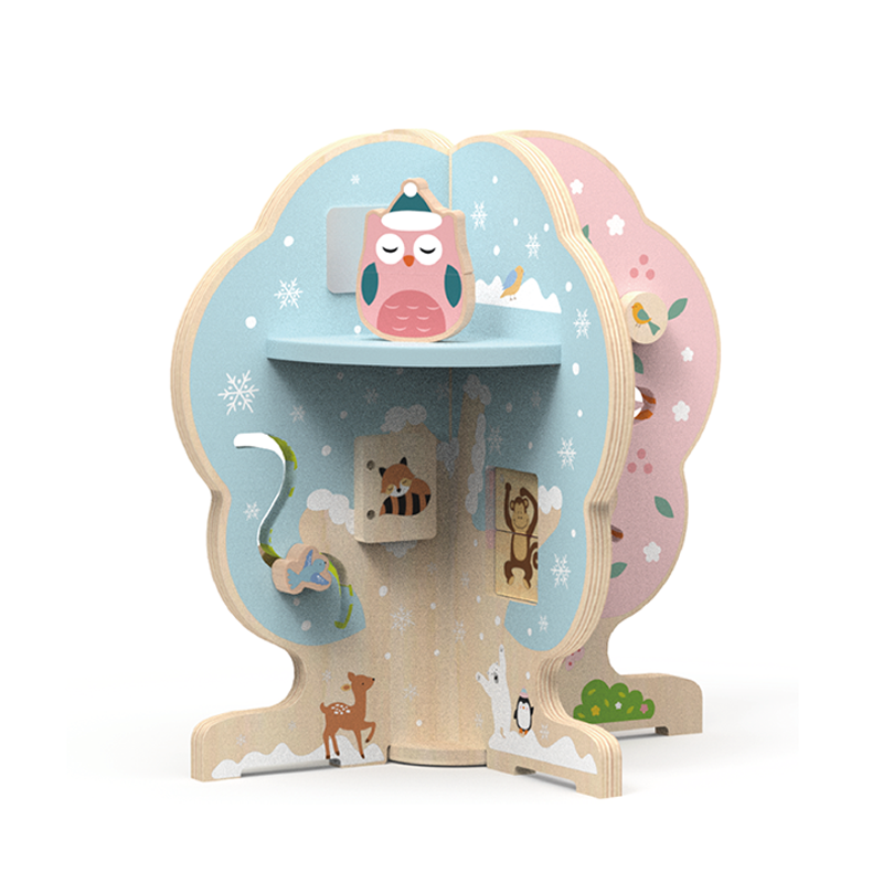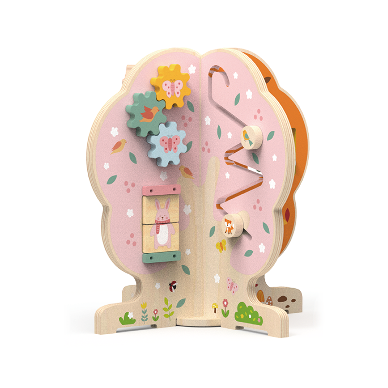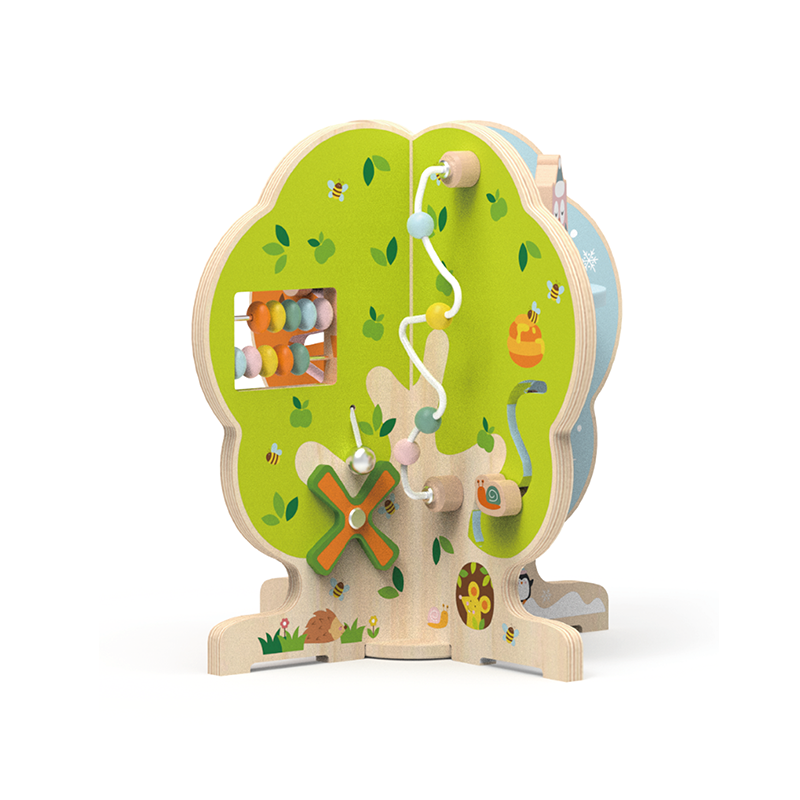 The 4 Seasons Learning Tree is a unique freestanding toy made from two cross-mounted wooden boards, creating an 8-sided activity center. Each side offers different play (gear, bead maze, windmill, etc.), with every two sides illustrating a season. It helps children learn about seasonal changes, storytelling, and develops fine motor skills. Complies with EU/US safety standards.