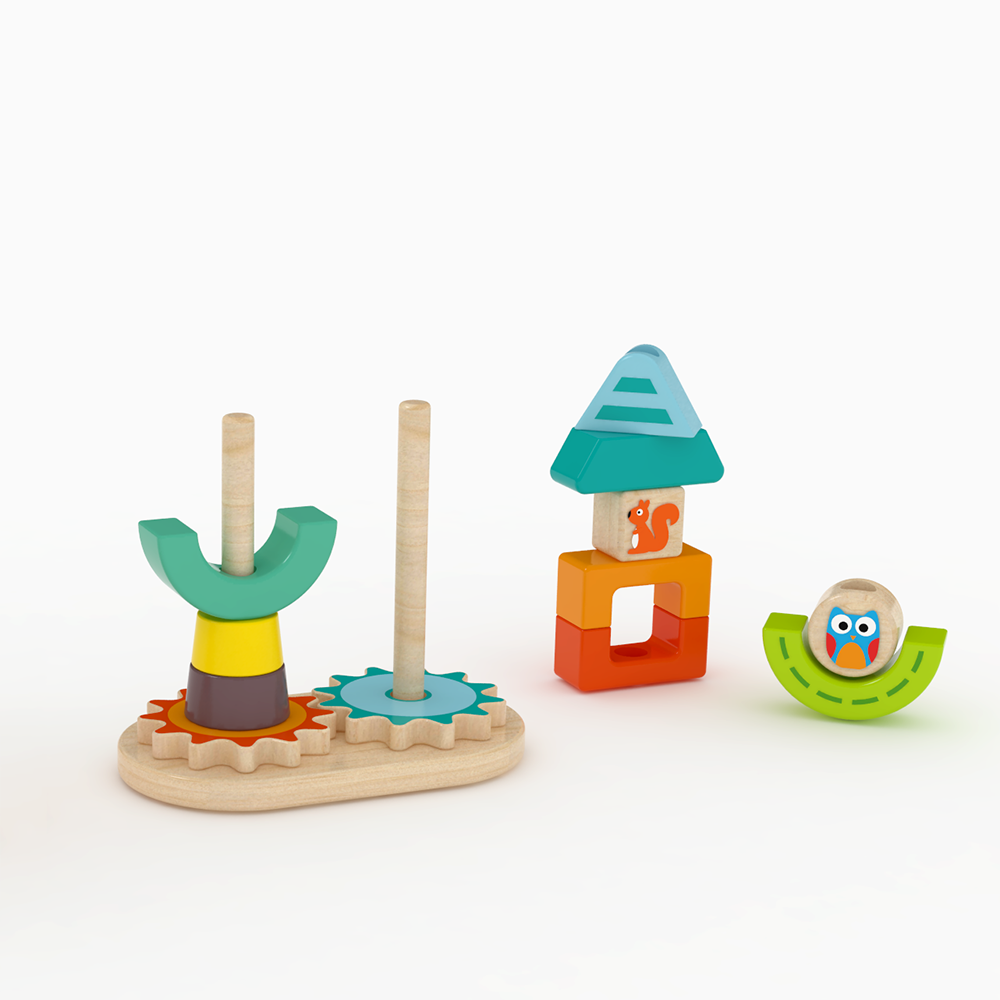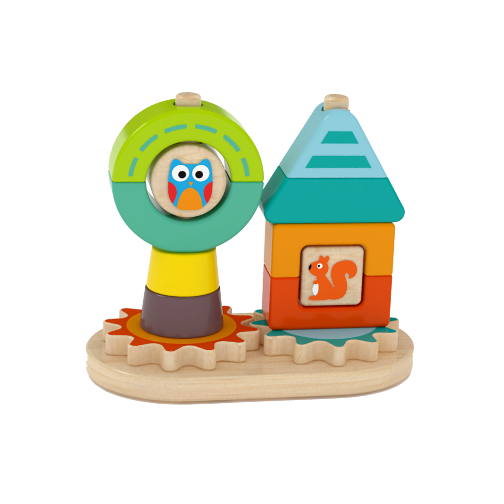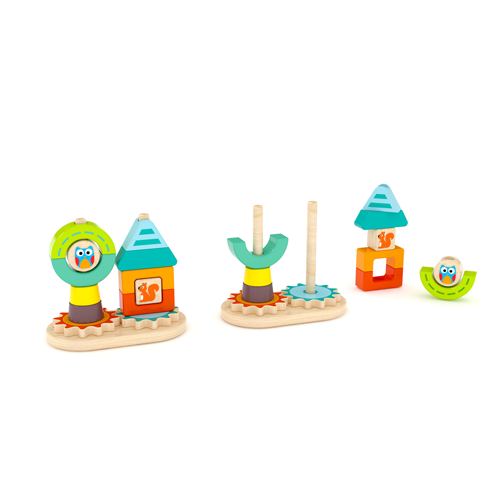 The Forst Shape Stacker features a wooden base with 2 posts for stacking different shapes, each adorned with cute animal figures. Its unique interlocking gears at the base rotate together when turned, teaching simple mechanics. This toy helps toddlers recognize shapes, identify colors, and develop fine motor skills. Complies with EU/US toy safety standards.
