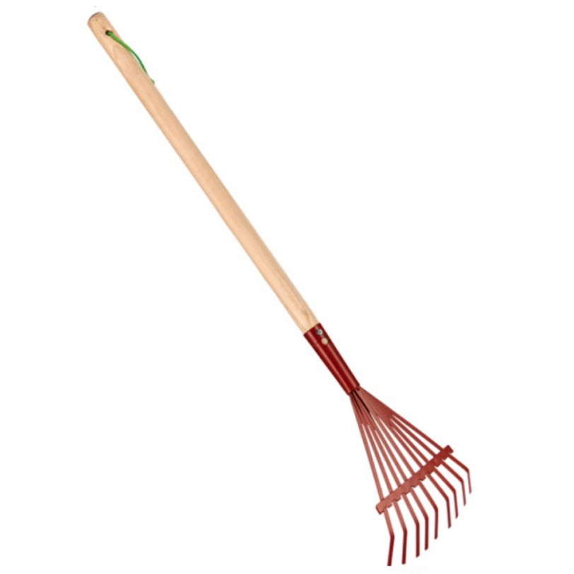 This child-size Kids Garden Leaf Rake(70cm long, 14cm wide) is designed for independent outdoor play and gardening activities. It features a durable powder-coated metal head and a comfortable wooden handle, perfectly sized for young hands. Complies with EU/US toy safety standards.