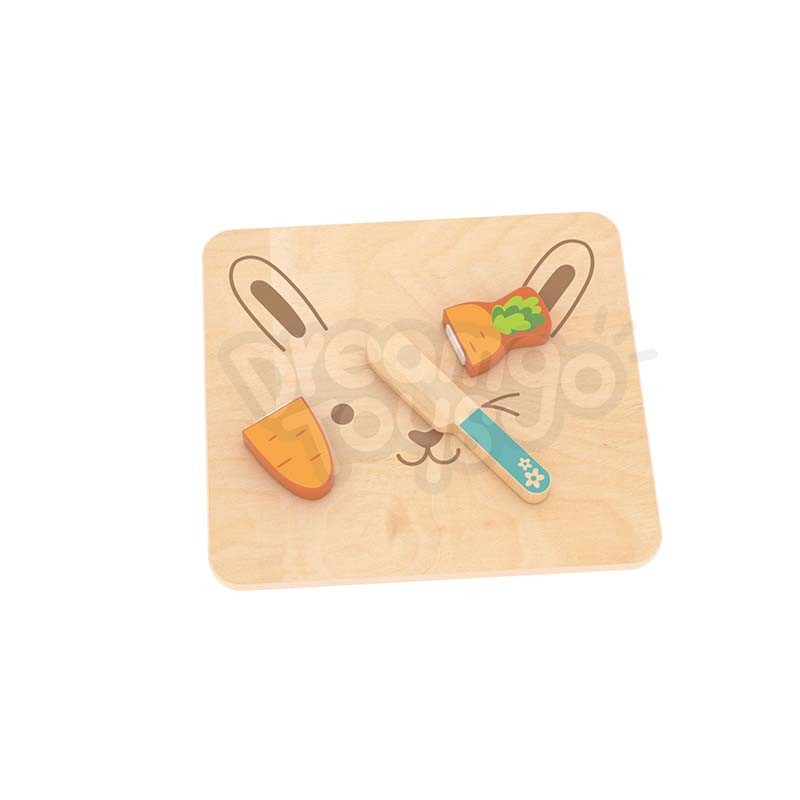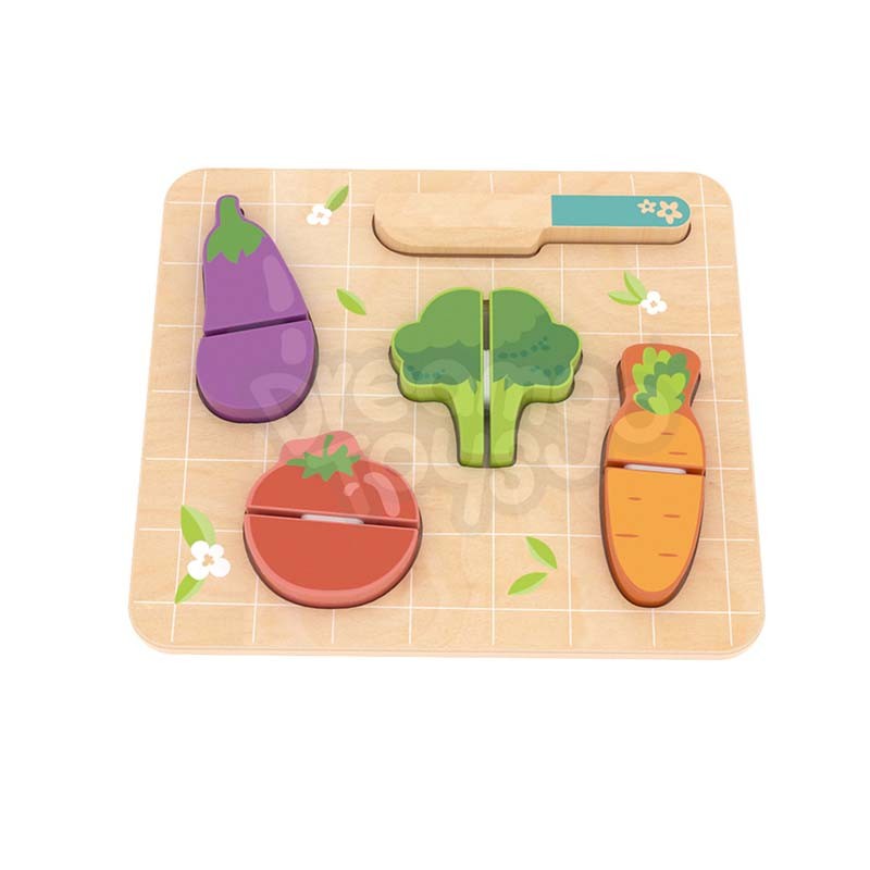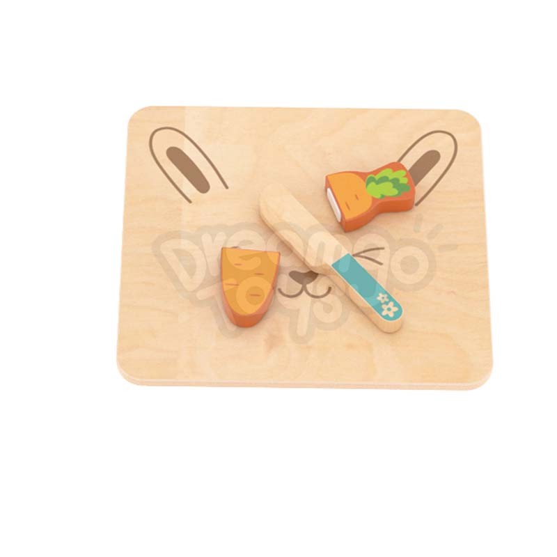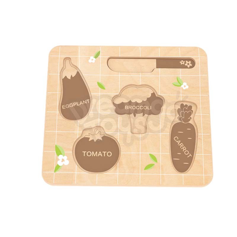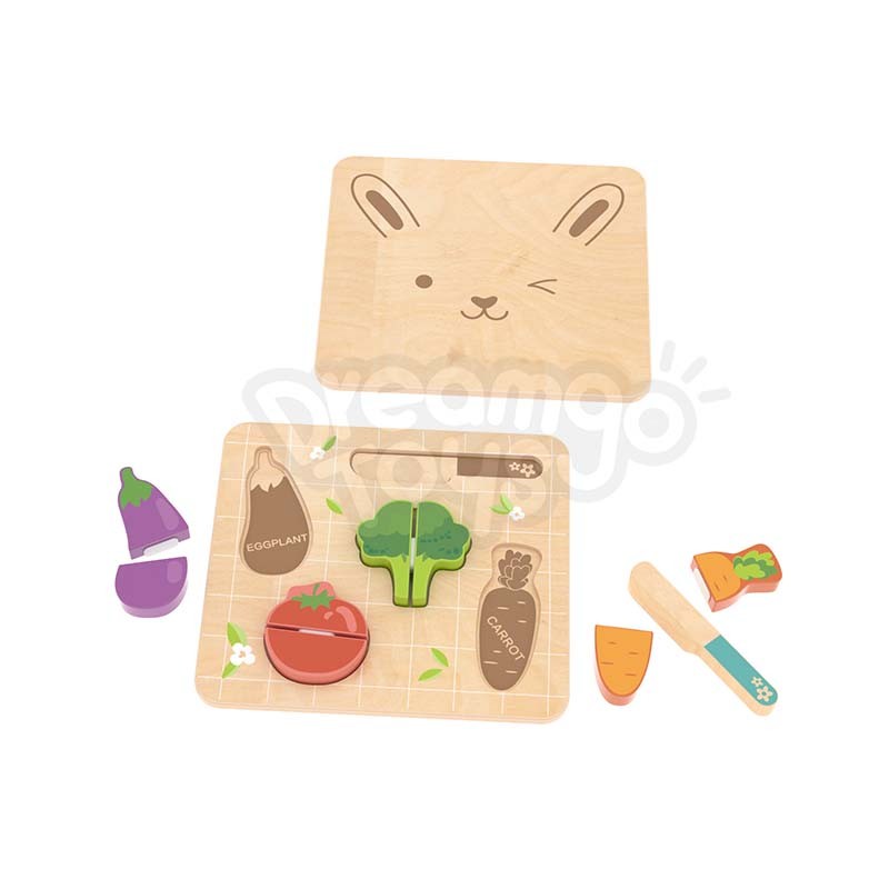 This educational cutting set includes 4 colorful wooden vegetables (eggplant, carrot, broccoli, tomato) and a wooden knife. The reversible board serves as both puzzle base and cutting board. Children develop fine motor skills by cutting the Velcro-connected pieces. Sized 20×18×1.5cm for toddlers 24+ months, meeting EU/US safety standards.