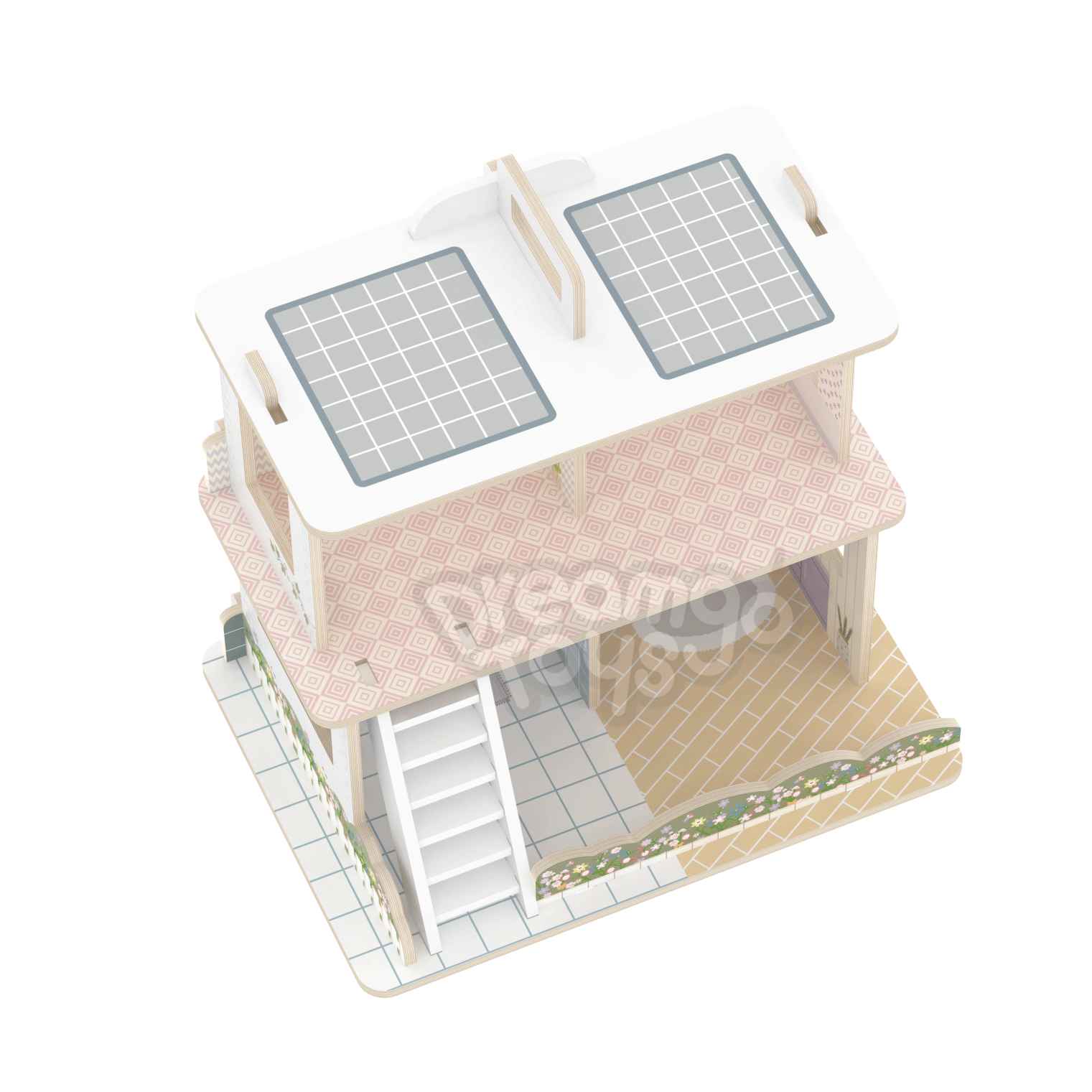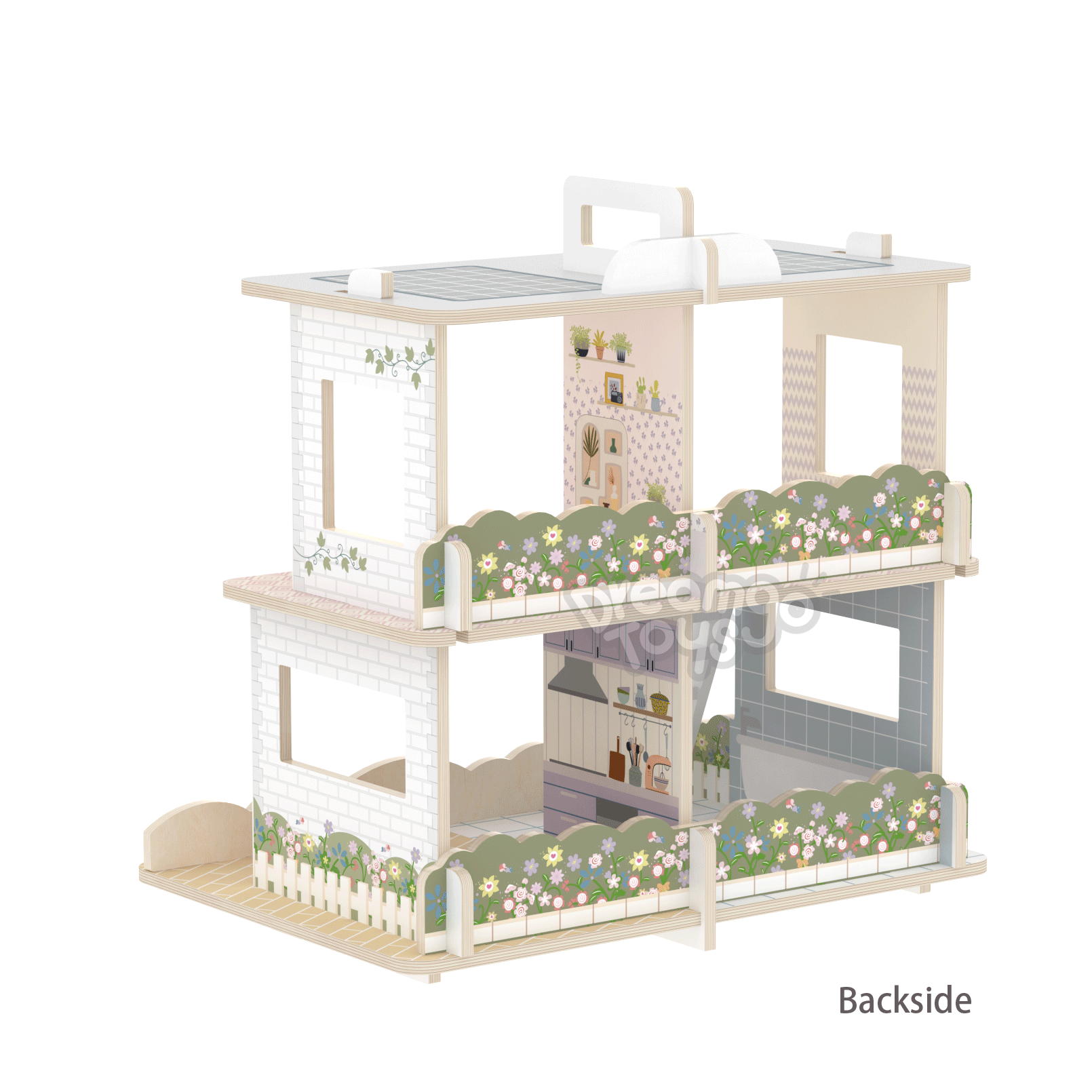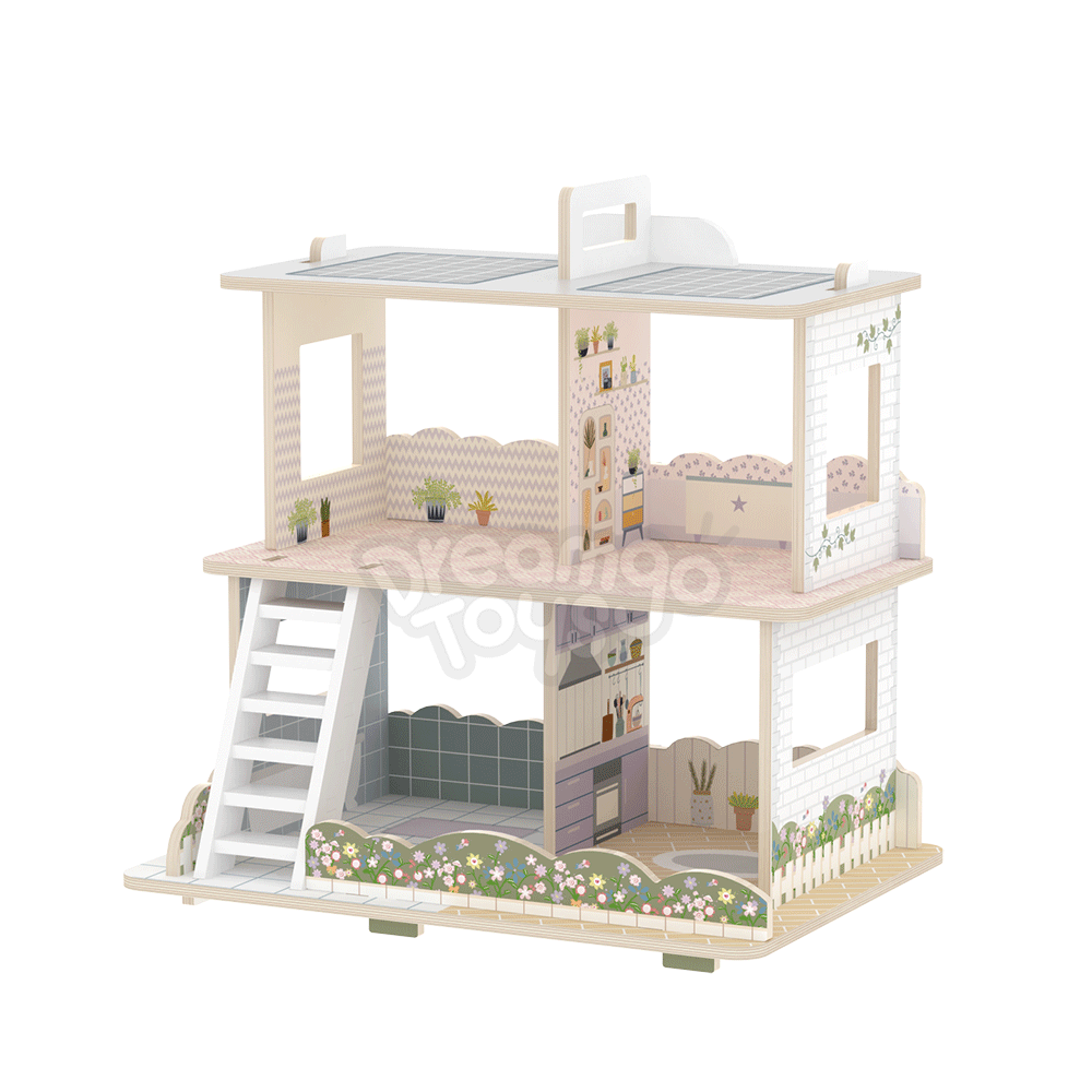 This Wooden Modern Villa Dollhouse features a contemporary design with 2 floors and front garden. Measuring 45x32x46cm, it contains 4 rooms connected by a stable 3D staircase. The screw-free interlocking design enables easy child assembly while ensuring structural integrity. Offers superior pricing and consistent quality compared to traditional screw-assembly dollhouses.