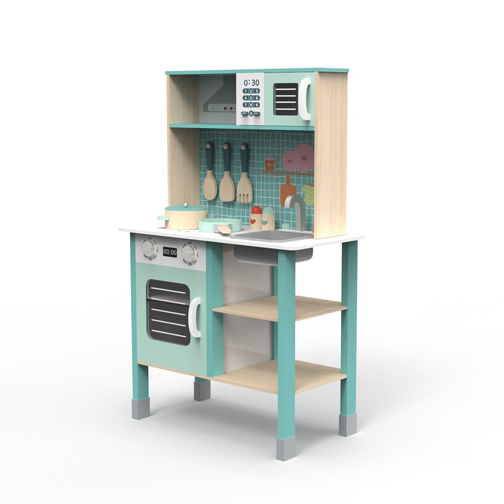 This full-size Wooden Modern Kitchen (61x30x79cm) with simulated microwave, stove, sink on top and storage space below. Perfect for encouraging imaginative role play and social skill development. Complies with EU/US toy safety standards.