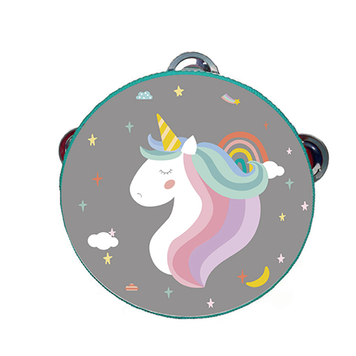 This delightful Wooden Tambourine features a 15cm diameter and is adorned with a popular unicorn theme that children love. Designed for small hands, it's an ideal first rhythm instrument to introduce babies 12 months and older to music, sound, and simple shaking motions, fostering auditory and motor development.
