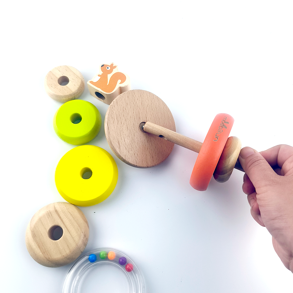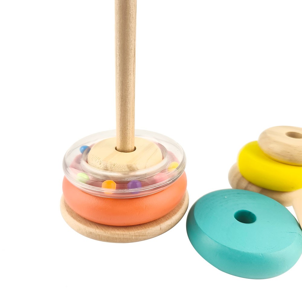 The Wooden Hedgehog Stacker features rainbow-colored rings stacked on a wobble base with a central rattle ring containing rolling beads. This multi-sensory toy develops fine motor skills, hand-eye coordination, balance awareness, and cause-effect understanding through stacking and sound exploration. Complies with EU/US toy safety standards.
